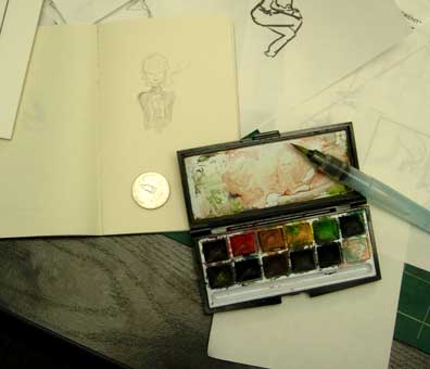 Ah yes, the famed waterbrush! A while ago I overheard Glenn Vilppu saying that years ago he couldn't find these here in the US and ordered them solely from Japan. He said he began telling art stores here about it, and after a while the craze caught on and it became popular. I don't know if Vilppu "brought" them to the US, but I wonder how Sketchcrawl would be without it... on second thought, I better not. I forgot which brand I buy them from, but apparently they come in different brush shapes - small and medium bristles, and also flat. Better start my Fabriano book as well - seems like the perfect combination.